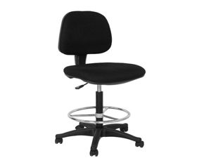 Silla cajero anatómica sin brazos, asiento y respaldar tapizado en tela con espuma dura de 6 cm. Sistema de regulación de altura mediante pistón, aro y pistón de acero color negro. Base de 5 puntas de nylon y garruchas de nylon, resiste hasta 120 Kg.